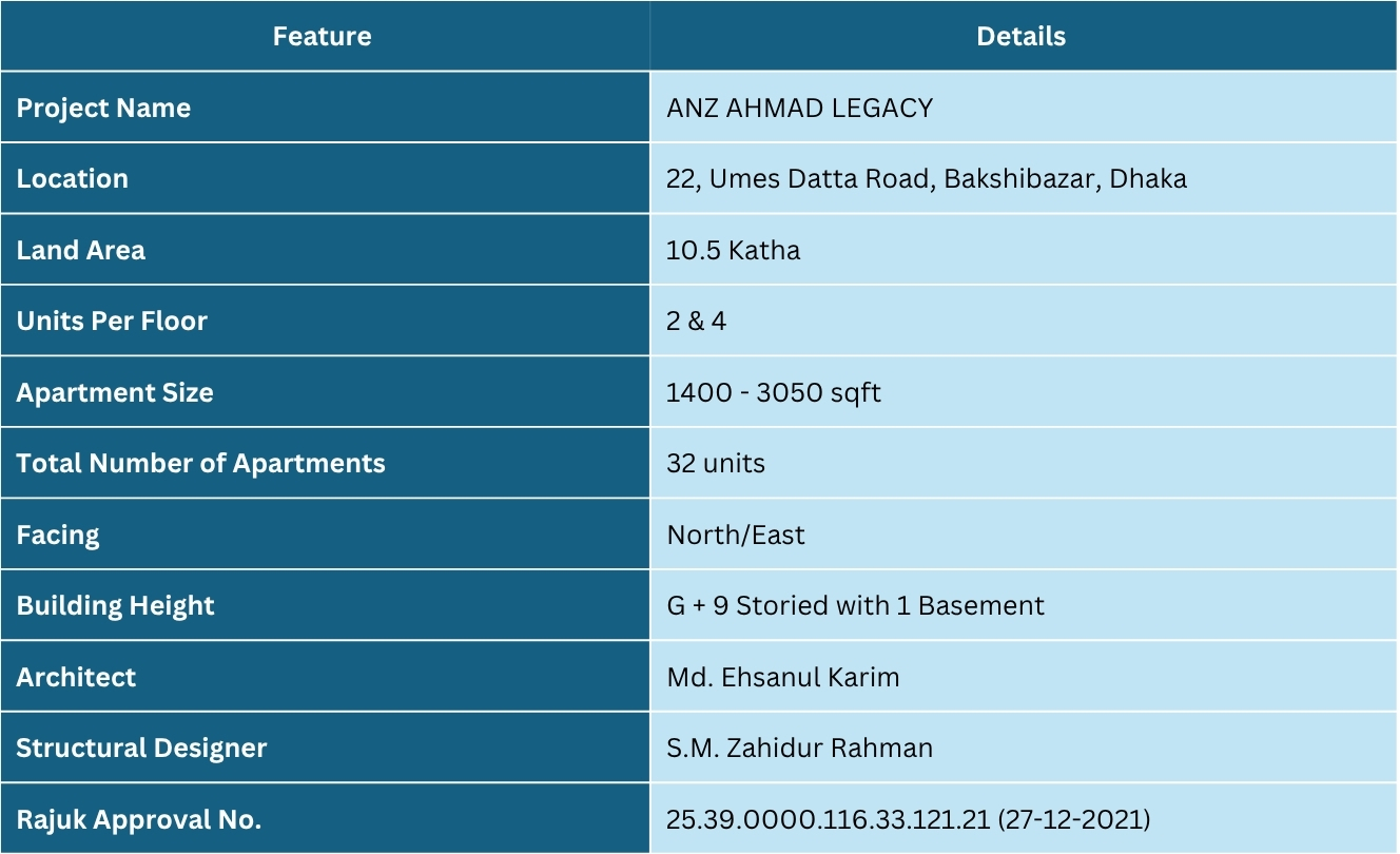Designed by renowned architect Md. Ehsanul Karim and structurally engineered by S.M. Zahidur Rahman, ANZ AHMAD LEGACY is built to offer not just homes, but legacies for future generations.